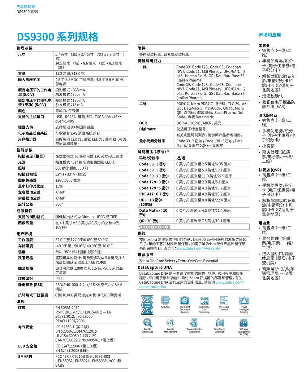 DS9300 系列条码扫描器搭载有 800 MHz 的微处理器、高分辨率的百万像素传感器以及特别的 PRZM 智能成像技术,可以在各种条件下立刻采集几乎任何介质上的条码。DS9300 系列扫描速度在业内更快,视野较同类产品更宽,能够以更迅速采集条形码。