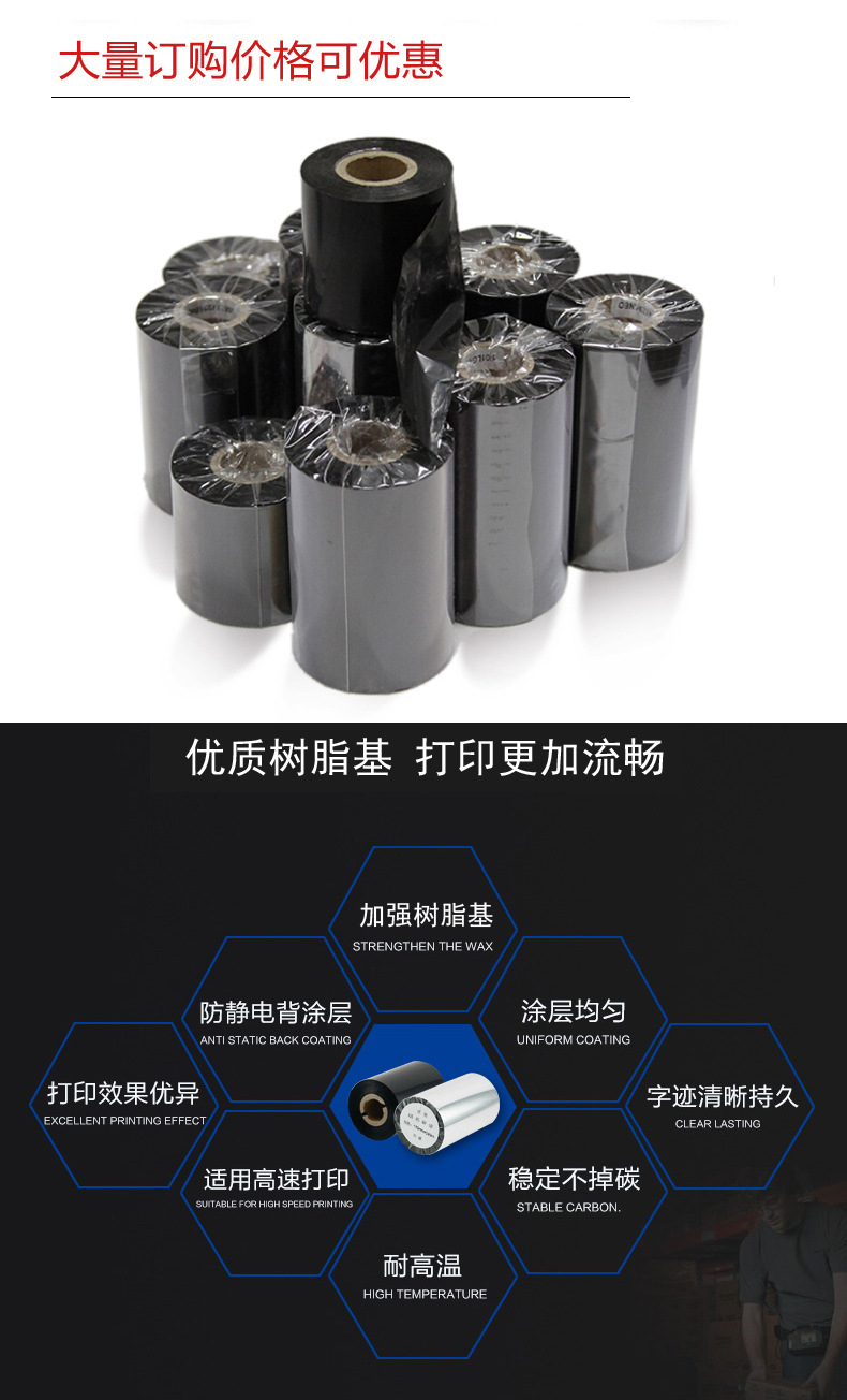 树脂基碳带即以蜡和碳黑(假设为黑色碳带)为主要材料,作为涂层材料的产品。树脂基碳带是最经济的碳带,主要用于一般纸张的打印,使用树脂基碳带必须注意的是与纸张的配合,树脂基碳带使用用于表面手感上略有凹凸的材质。树脂基碳带约占有市场的70%左右份额,是一般打印麦头等大型纸张标签常用的产品。